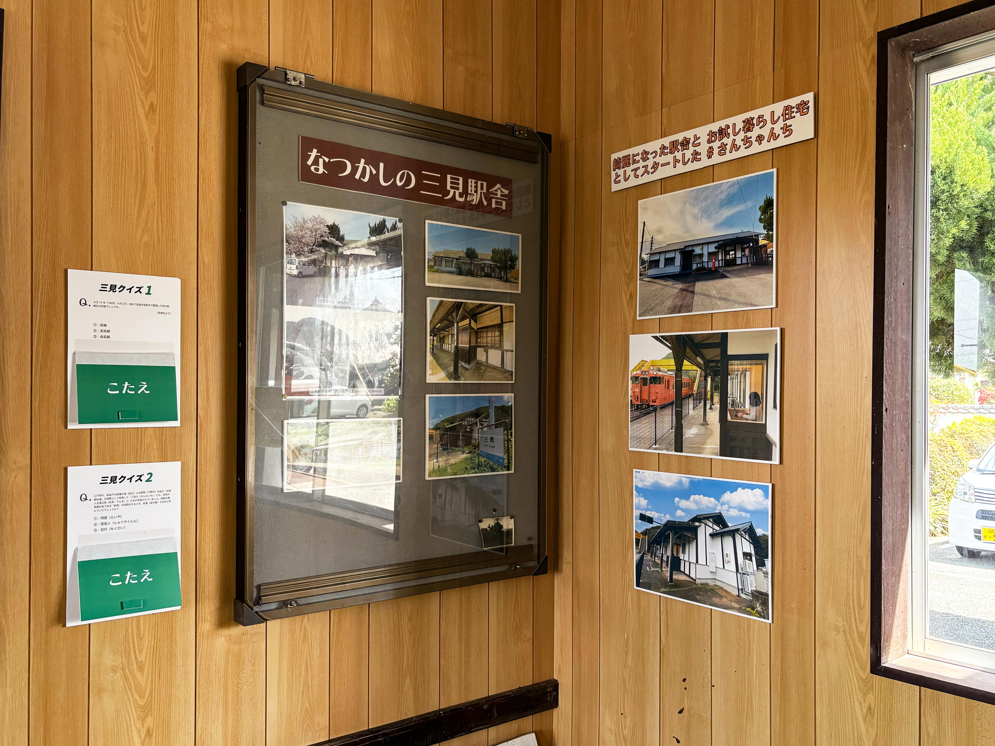 駅の待合室には、その時の様子や改修前の三見駅舎、開所式の様子、楽しい三見クイズなどをパネル展示しています。